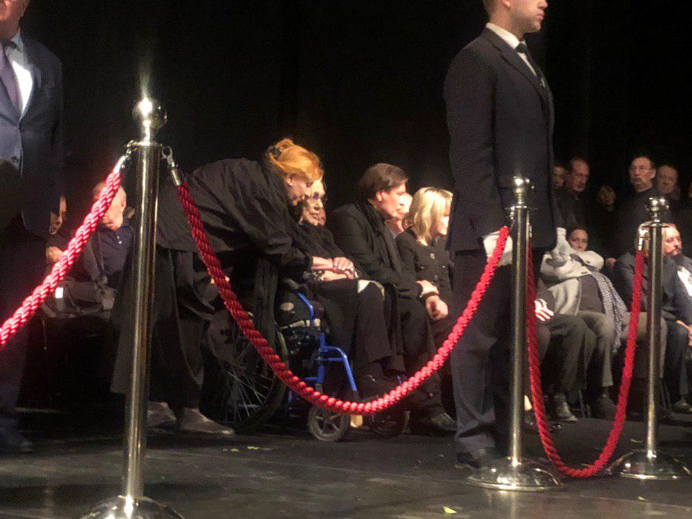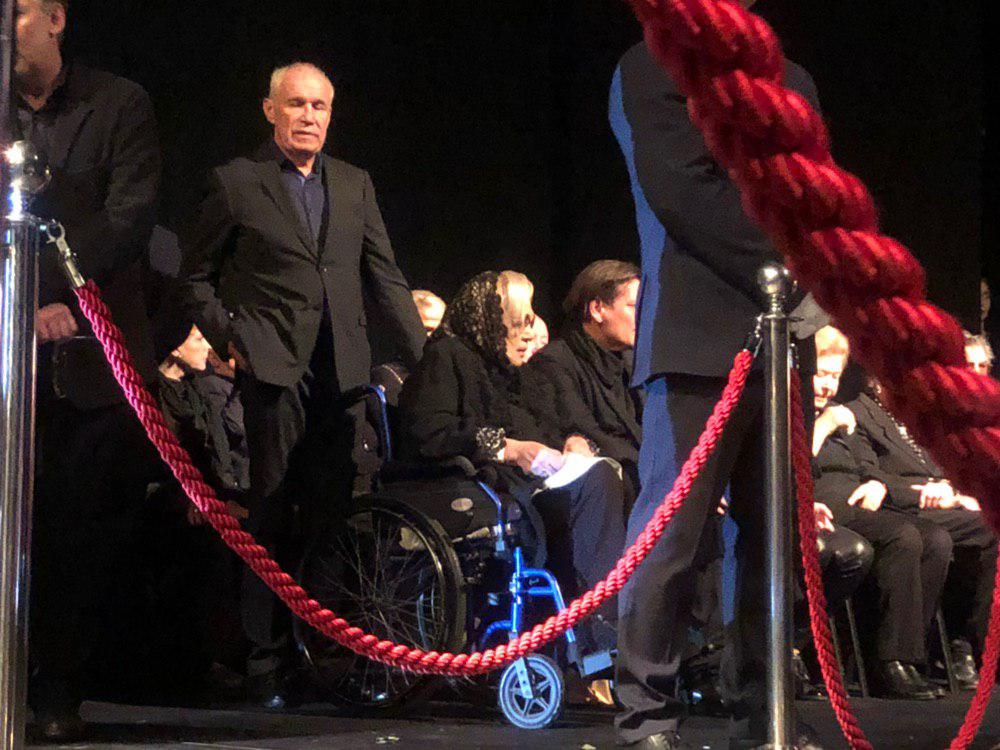 Российская актриса театра и кино и художественный руководитель театра "Современник" Галина Волчек также присутствует в зале. Ее в инвалидной коляске привез актер Сергей Гармаш (на фото стоит за ней). Обращает на себя внимание ее очень болезненный вид и тремор.