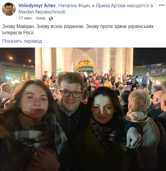 Также на этом митинге присутствует нардеп от "Европейской солидарности" Владимир Арьев. "Опять Майдан. Опять всей семьей. Опять против сдачи украинских интересов России", - написал он.