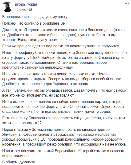 Сначала он вынужден был объяснять, почему подписал "формулу Штайнмайера" по Донбассу. Это большой шаг вперед - и если Украина на нем не остановится, то в "ЛДНР" могут пройти выборы. Которые положат конец войне.
