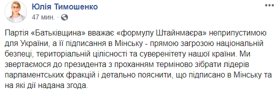 "Партия "Батькивщина" считает "формулу Штайнмайера" недопустимой для Украины, а ее подписание в Минске - прямой угрозой национальной безопасности, территориальной целостности и суверенитету нашей страны. Мы обращаемся к президенту с просьбой срочно собрать лидеров парламентских фракций и подробно объяснить, что подписано в Минске и на какие действия дано согласие".