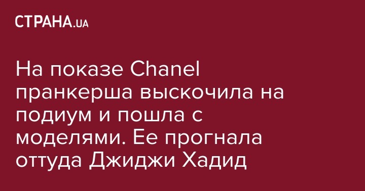 24-летняя американская супермодель Джиджи Хадид во время модного показа не растерялась и строго выпроводила с подиума забравшуюся туда ради YouTube-славы пранкершу. Инцидент произошел в модном доме Chanel и попал на видео, которое разлетелось в соцсетях.