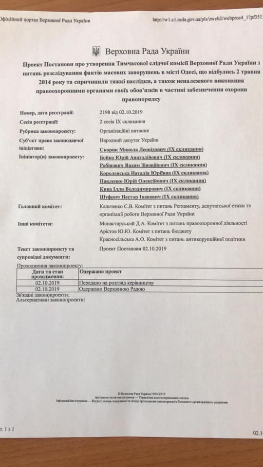 Парламент Украины 2 октября зарегистрировал проект постановления о создании временной следственной комиссии (ВСК) по событиям 2 мая 2014 года в Одессе. Об этом на своем Facebook написал нардеп от "Оппозиционной платформы - За жизнь" Николай Скорик.