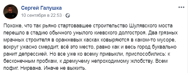 Об остановке работ на Шулявском мосту пользователи соцсетей заговорили еще в середине сентября. Так, киевлянин Сергей Галушка написал на Facebook, что мост превратился в обычный долгострой.