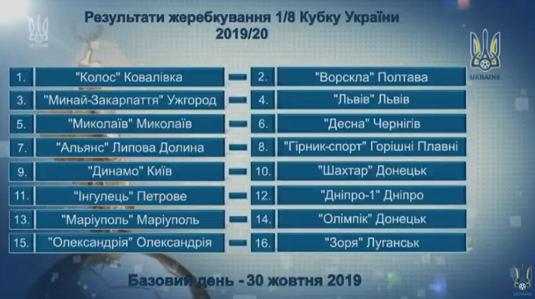 В столичном Доме футбола прошла жеребьевка 1/8 финала Кубка Украины. По результатам слепого жребия, на очередном этапе первенства друг против друга сыграют киевское "Динамо" и донецкий "Шахтер". А "Александрия" поборется с луганской "Зарей".