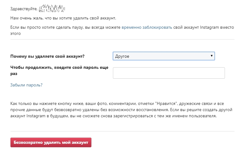 Если вы точно решили, что соцсетью пользоваться не будете и страница вам не нужна, можно воспользоваться окончательным удалением аккаунта. Имейте в виду, что при выборе этой опции восстановить аккаунт будет невозможно. Вы не сможете также снова зарегистрироваться в соцсети под тем же именем. Все публикации, фото, видео, истории, подписчики, описание профиля - все это удаляется навсегда. Так что не забудьте перед удалением сохранить все, что считаете нужным.