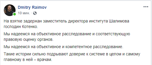 "На взятке задержан заместитель директора института Шалимова господин Котенко. Мы надеемся на объективное расследование и соответствующую правовую оценку органов... Такие истории сильно подрывают доверие к системе в целом и самому главному в ней - врачам", - написал Раимов, однако несколько позже он свое сообщение из Facebook удалил.