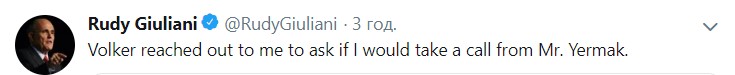 Две недели назад в одном из интервью Ермак сообщил, что его встреча с Джулиани в начале августа в Мадриде состоялась по его инициативе после озвученных адвокатом Трампа причин отмены его визита в Украину в мае 2019 года.