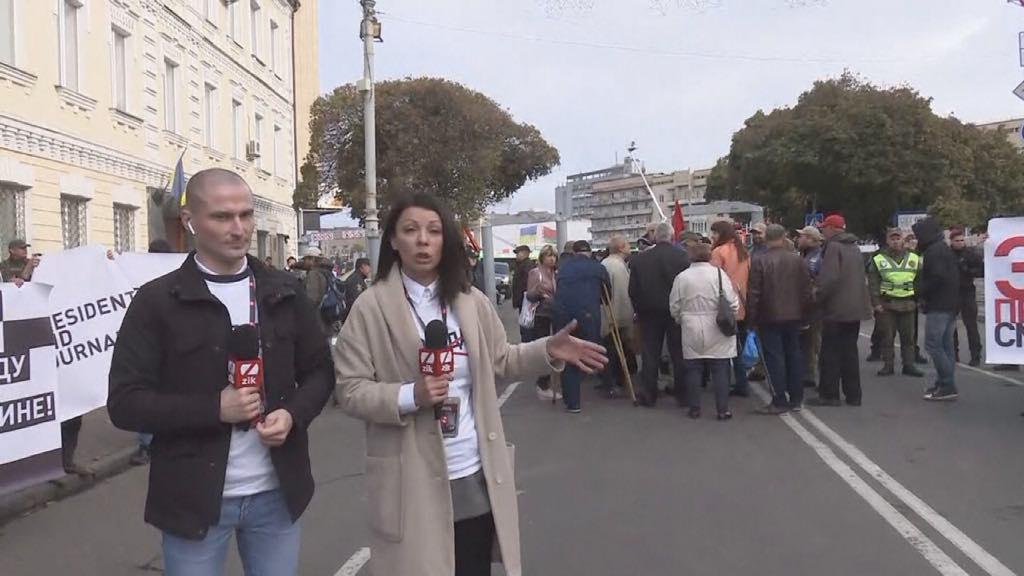 Митингующие с плакатами "Зеленский против свободы слова" и в футболках "Зе против СМИ" заявляют, что сами хотят решать, какие каналы им смотреть.
