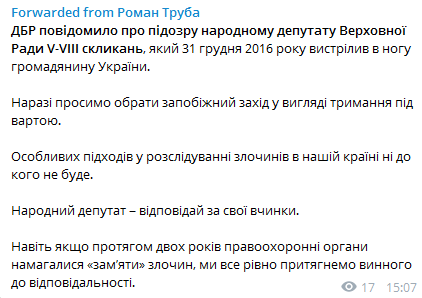 "ГБР сообщило о подозрении народному депутату Верховной Рады V-VIII созывов, который 31 декабря 2016 выстрелил в ногу гражданину Украины. Сейчас просим избрать меру пресечения в виде содержания под стражей. Особых подходов в расследовании преступлений в нашей стране ни к кому не будет", - написал в Telegram-канале директор ГБР Роман Труба.