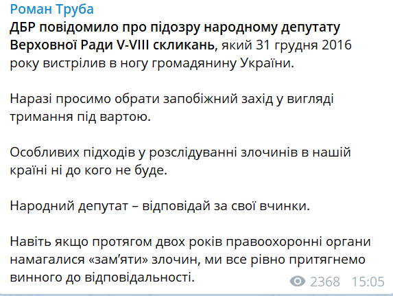 "ГБР сообщило о подозрении народному депутату Верховной Рады V-VIII созывов, который 31 декабря 2016 выстрелил в ногу гражданину Украины. Сейчас просим избрать меру пресечения в виде содержания под стражей. Особых подходов в расследовании преступлений в нашей стране ни к кому не будет", - написал в Telegram-канале директор ГБР Роман Труба.