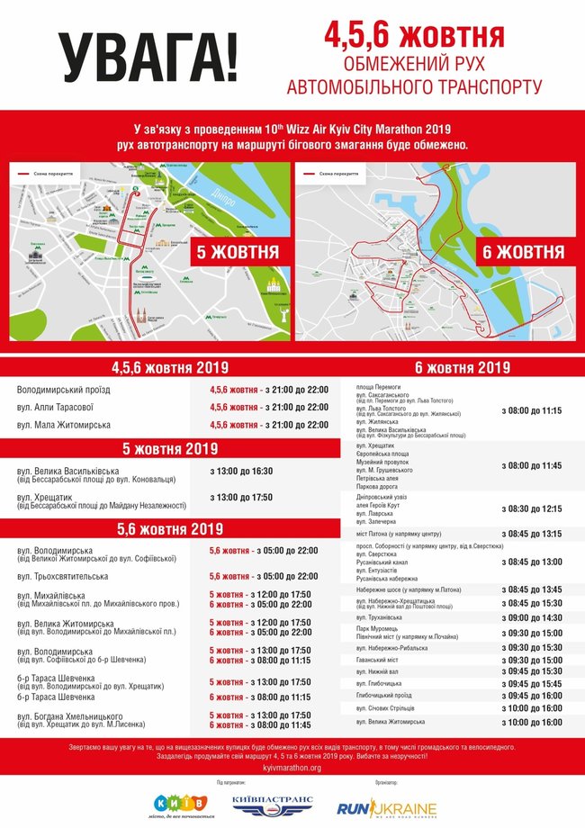 В первые выходные октября, 5-6 октября, с 08:00 до 18:10 в столице пройдет "10-й Киевский международный марафон" ("10th Wizz Air Kyiv City Marathon"). В связи с этим событием распоряжением КГГА предусмотрен запрет проезда по некоторым улицам.