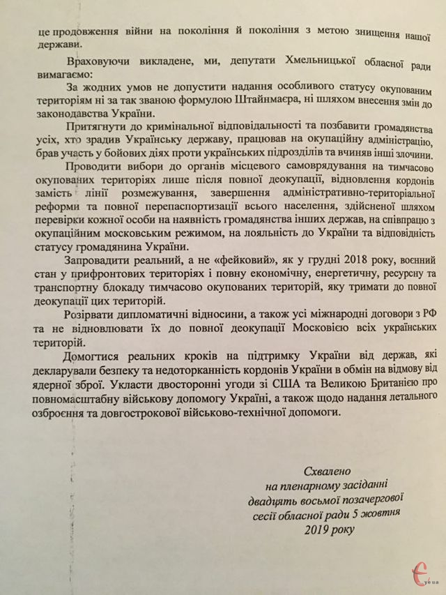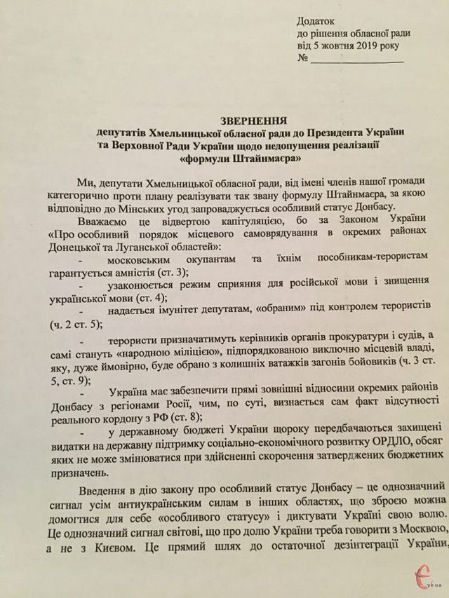 На внеочередной сессии Хмельницкого областного совета 5 октября депутаты единогласно приняли обращение к президенту Украины Владимиру Зеленскому и Верховной Раде о недопущении реализации "формулы Штайнмайера". Об этом сообщает сайт "Є".