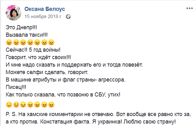 "Вызвала такси!!! Сейчас!! 5 год войны! Говорит, что ждет своих!!! И мне надо сказать и поддержать его и тогда повезет. Можете селфи сделать, говорит. В машине атрибуты и флаг страны-агрессора. Писец!!! Как только сказала, что позвоню в СБУ, утих!" - сказано в посте Белоус.