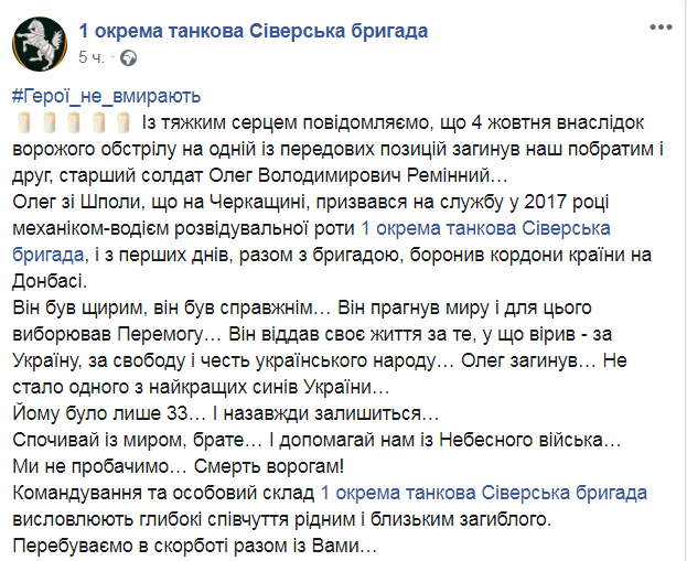 В результате обстрела на Донбассе на передовых позициях 4 октября погиб старший солдат, танкист из разведроты Олег Владимирович Ременный. Об этом сообщается на Facebook 1-й отдельной танковой Северской бригады.
