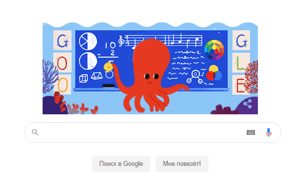 На дудле изображен осьминог-учитель. который стоит у доски, на которой изображены геометрические фигуры, математические примеры, нотная строка, формула химического соединения. Осьминог при наведении на него курсора пишет на доске, стирает ответ, собирает домашние работы, выдает инвентарь своим ученикам-рыбам.
