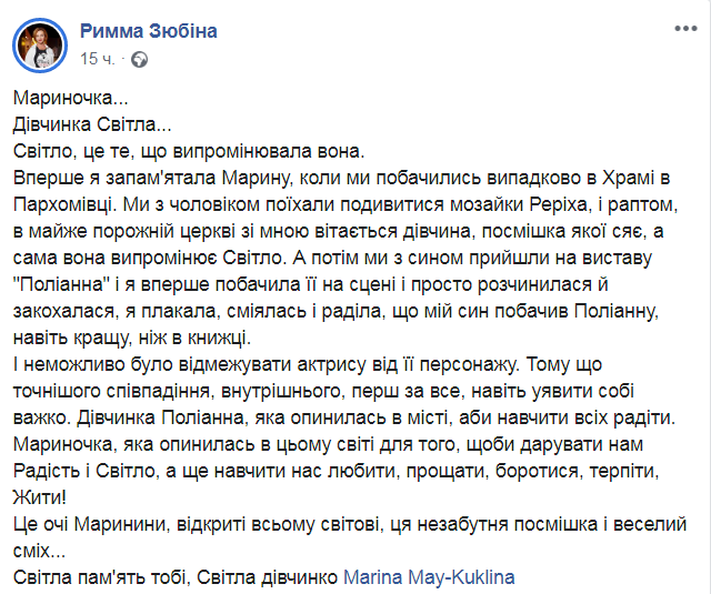 "Свет - это то, что излучала она. Впервые я запомнила Марину, когда мы увиделись случайно в храме в Пархомовке. Мы с мужем поехали посмотреть мозаики Рериха и вдруг, в почти пустой церкви со мной здоровается девушка, улыбка которой сияет, а сама она излучает свет... Мариночка, которая оказалась в этом мире для того, чтобы дарить нам радость и свет, а еще научить нас любить, прощать, бороться, терпеть, жить!", - написала Зюбина.