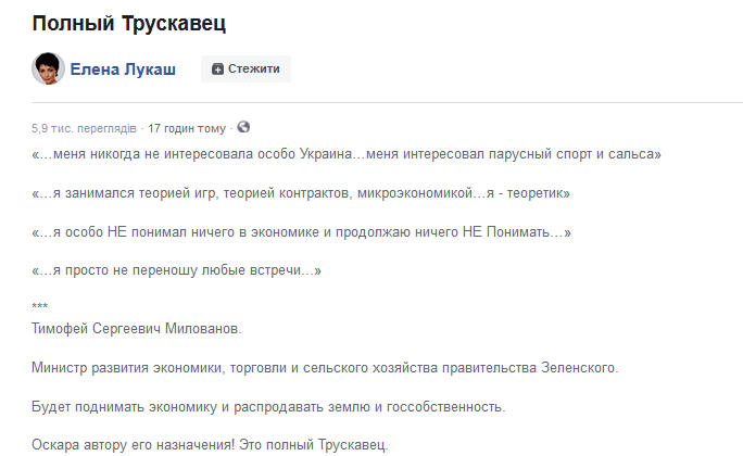 "Тимофей Сергеевич Милованов. Министр развития экономики, торговли и сельского хозяйства правительства Зеленского. Будет поднимать экономику и распродавать землю и госсобственность.  Оскара автору его назначения! Это полный Трускавец!", - написала Елена Лукаш.