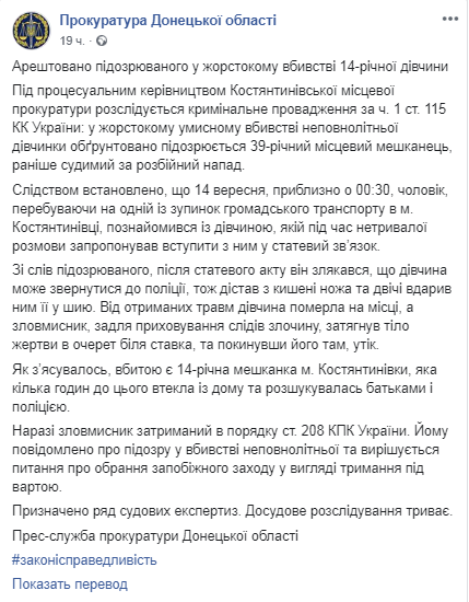 В Константиновке (Донецкая область) поймали 39-летнего мужчину, который изнасиловал и убил 14-летнюю девочку. Об этом в Facebook сообщает пресс-служба Прокуратуры Донецкой области.