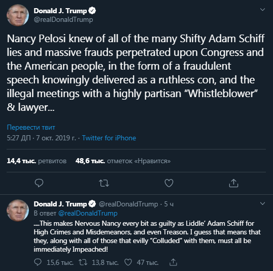 "Это делает нервную Нэнси такой же виновной, как и Адама Шиффа, в особо тяжких преступлениях и правонарушениях и даже в государственной измене. Я считаю, это означает, что им вместе со всеми теми, кто злостно вступал в сговор, должен быть немедленно объявлен импичмент!", - написал Дональд Трамп.