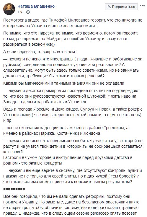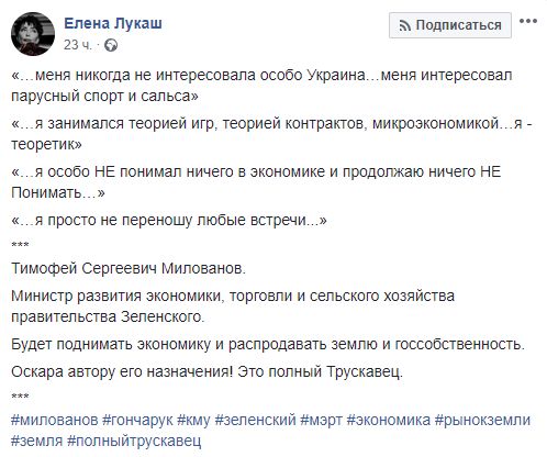 "Посмотрела видео, где Тимофей Милованов говорит, что его никогда не интересовала Украина и он не знает экономики... Понимаю, что это нарезка, понимаю, что возможно, потом он говорит: но когда я приехал на Майдан, я полюбил Украину и сразу начал разбираться в экономике))
