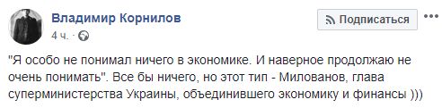 Политолог Владимир Корнилов также цитирует министра: "Я особо не понимал ничего в экономике. И наверное продолжаю не очень понимать". Все бы ничего, но этот тип - Милованов, глава суперминистерства Украины, объединившего экономику и финансы".