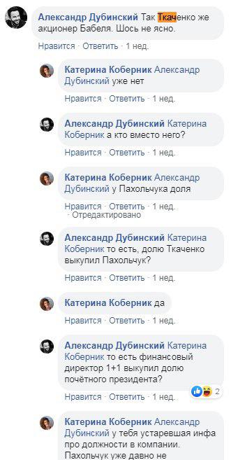 Отметим, что в ООО "Бабель", которому принадлежит интернет-издание TheБабель, Ткаченко указал себя как бенефициарного собственника (контролера). Что интересно, 24 сентября директор департамента новостей медиагруппы по новым медиа и руководитель ресурсом ТСН.ua Катерина Коберник, которая работает сейчас в theБабель, сообщила в переписке с нардепом Александром Дубинским, что сам Ткаченко свою долю продал.
