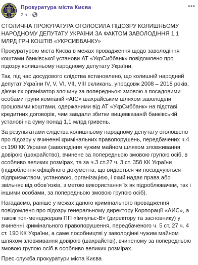 Киевская прокуратура объявила подозрение бывшему депутату Верховной Рады Дмитрию Святашу в хищении 1 100 000 000 гривен Уксиббанка. Об этом сообщает пресс-служба прокуратуры в Facebook.