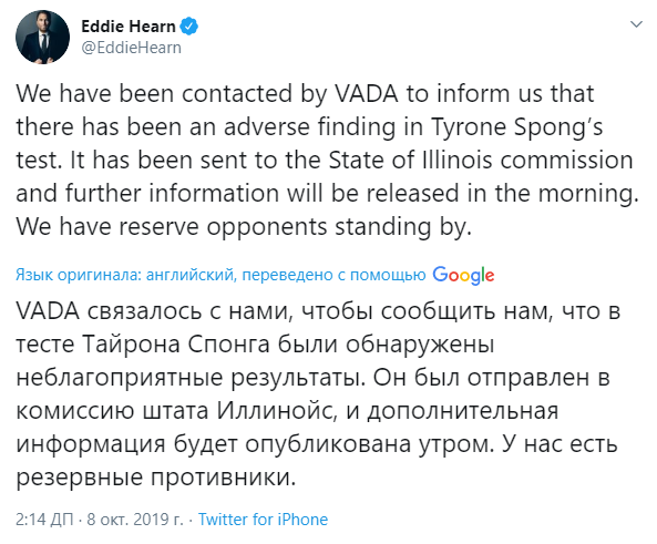 Сам Спонг заявил, что чист и назвал случившееся подставой, чтобы отстранить его от боя. Он пообещал бороться за репутацию.