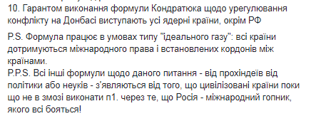 Кондратюк пишет, что жителям неподконтрольной части Донбасса в течение месяца с момента полного восстановления власти Киева нужно будет определиться - хотят ли они жить в государстве Украина.