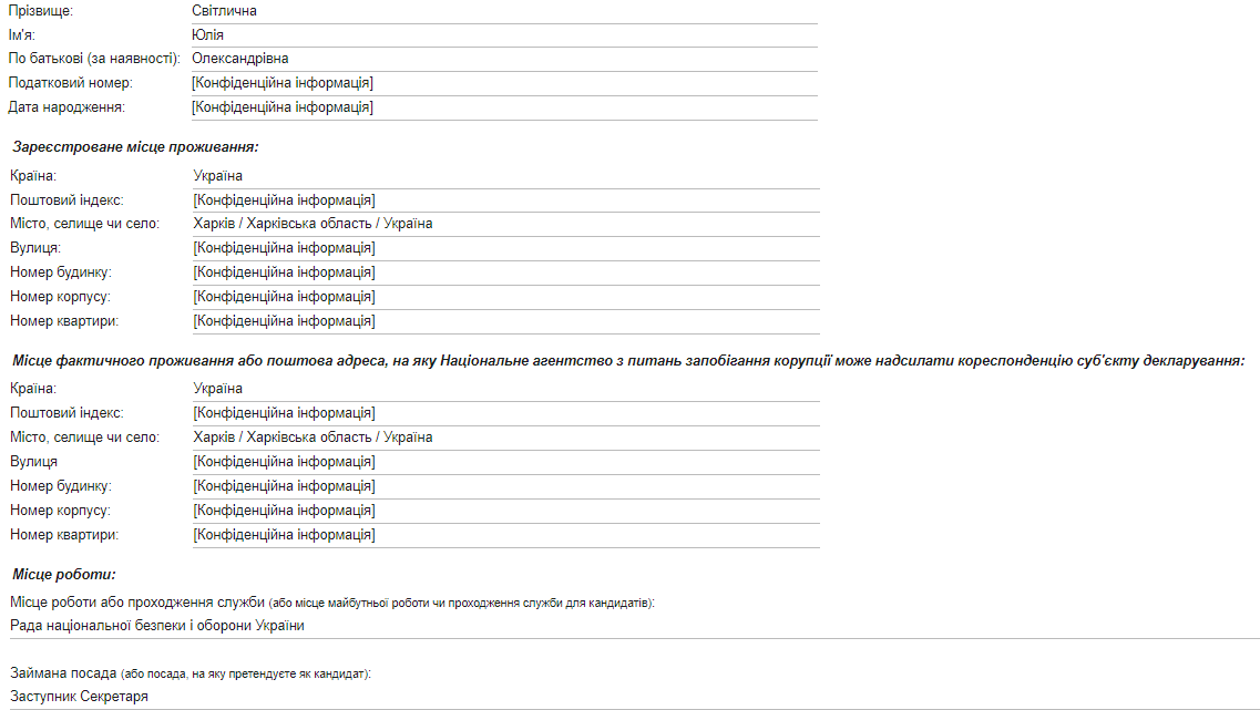 Нынешний губернатор Харьковской области Юлия Светличная, назначенная на эту должность в 2016 году, может стать заместителем секретаря СНБО. Об этом свидетельствуют ее декларация как кандидата на должность, опубликованная на сайте НАПК.