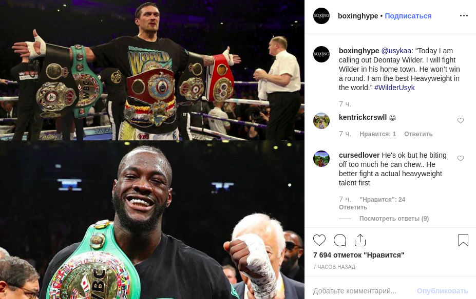 Ранее американский боксер Деонтей Уайлдер заявил, что не видит в лице Александра Усика серьезного соперника. Он считает украинца слишком мелким для супертяжелого дивизиона.