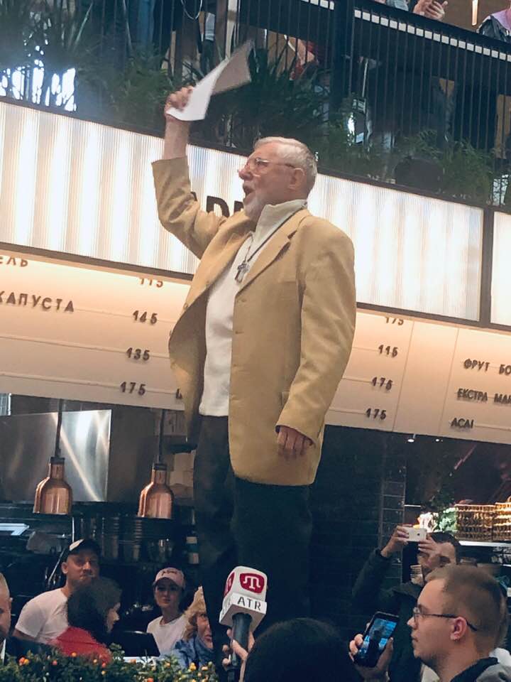 10:54  Зеленский стоит на галерке, а снизу ему кричат представители активистов, которые пришли под фудкорт. Президент тем временем ждет кофе. "Что там с кофе?" "Сейчас несут".