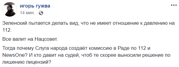 Тогда почему Слуга народа создаёт комиссию в Раде по 112 и NewsOne? И кто давит на судей, чтоб те скорее выносили решение по лишению лицензий?", - пишет в Facebook главный редактор "Страны" Игорь Гужва.
