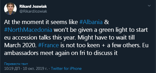 "На данный момент кажется, что Албании и Северной Македонии не дадут зеленый свет для начала переговоров о вступлении в ЕС в этом году. Возможно, придется подождать до марта 2020 года. Франция не очень заинтересована плюс несколько других. Послы ЕС встретятся снова в пятницу, чтобы обсудить этот вопрос", - написал он.