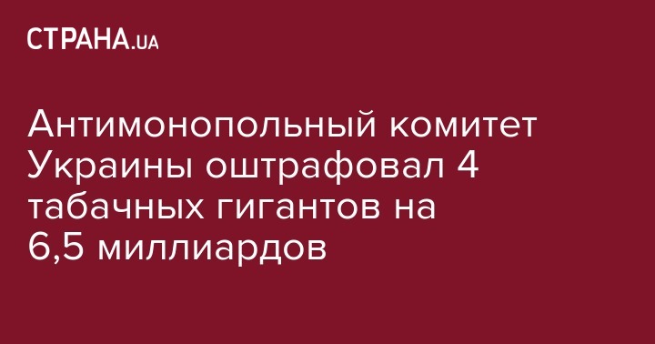 Сегодня, 10 октября, Антимонопольный комитет Украины оштрафовал на 6,5 млрд грн четырех крупнейших производителей табачных изделий в Украине Филип Моррис, Джей Ти Интернешнл, Империал Тобакко Продакшн и Бритиш Американ Тобакко (Прилуки) за монополизацию рынка компанией Тедис Украина и самого дистрибьютора. Об этом сообщается на сайте ведомства.