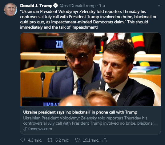 В частности Трамп опубликовал ссылку на материал Foxnews, в котором было сказано: "Президент Украины Владимир Зеленский заявил журналистам в четверг, что его скандальный июльский разговор с президентом Трампом не предусматривал взяток, шантажа или предложения услуги за услугу, как утверждают демократы, настроенные на импичмент".
