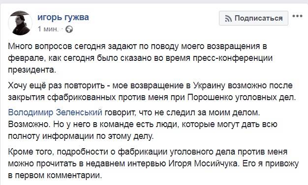 "Много вопросов сегодня задают по поводу моего возвращения в феврале, как сегодня было сказано во время пресс-конференции президента. Хочу еще раз повторить — мое возвращение в Украину возможно после закрытия сфабрикованных против меня при Порошенко уголовных дел", — написал главред сайта.