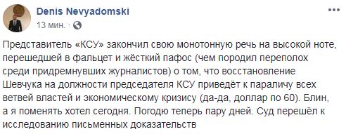 Советник Шевчука Денис Невьядомский написал в Facebook, что представитель КСУ закончил "свою монотонную речь на высокой ноте, перешедшей в фальцет и жесткий пафос (чем породил переполох среди придремнувших журналистов) о том, что восстановление Шевчука на должности председателя КСУ приведёт к параличу всех ветвей властей и экономическому кризису (да-да, доллар по 60)". "Блин, а я поменять хотел сегодня. Пдожду теперь пару дней", - с иронией отметил юрист.