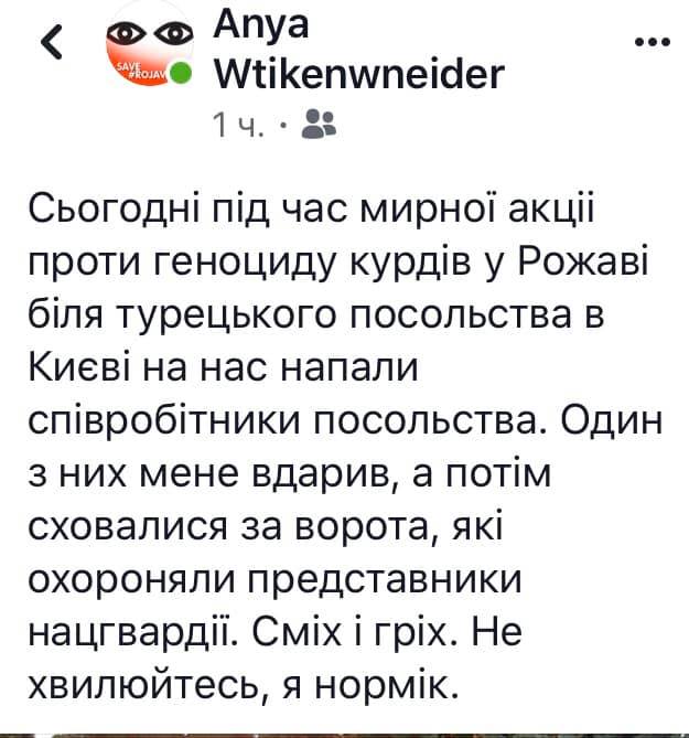 "Сегодня во время мирной акции против геноцида курдов в Рожави у турецкого посольства в Киеве на нас напали сотрудники посольства, а затем скрылись за ворота, которые охраняли представители Нацгвардии. Смех и грех. Не волнуйтесь, я нормик", - написала девушка.