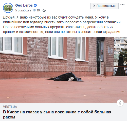 Пост Гео Лероса процитировал центр УПЦ, поинтересовавшись на своей странице в Facebook у подписчиков, что они думают об эвтаназии.