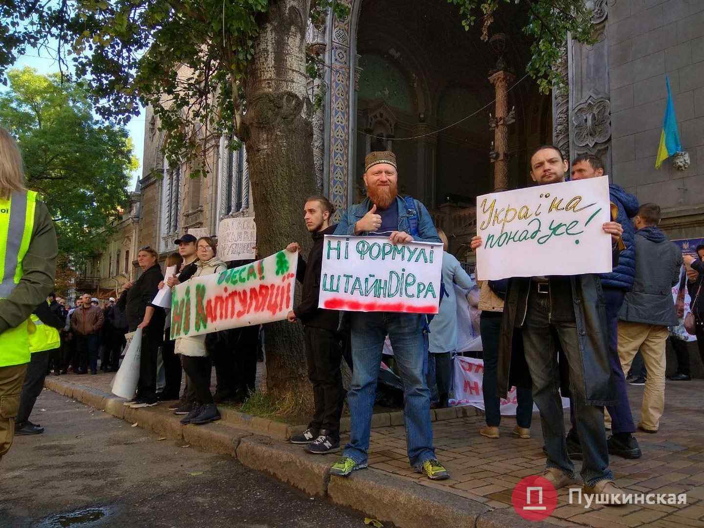 "Если мы говорим о "штабе сопротивления капитуляции", в который входят многие общественные организации, то мы пришли по поводу формулы Штайнмайера. Мы проводим такие акции по всей Украине", - рассказал лидер одесской ячейки "Нацкорпуса" Сергей Варламов.