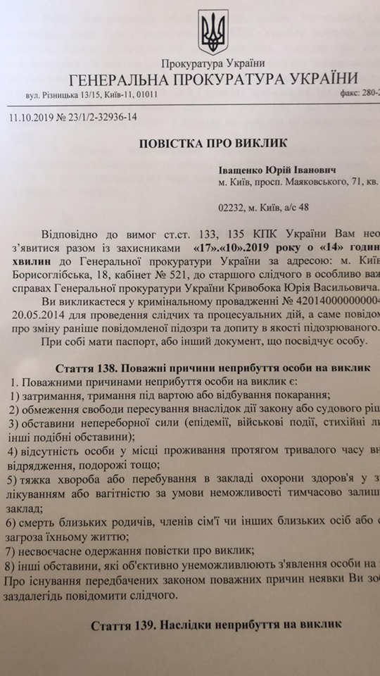 "Сегодня управление ГПУ Горбатюка пригласило и меня тоже для вручения уточненного подозрения по старому забытому делу 2014 года. Напомню, это дело, которое Горбатюк состряпал исключительно для подтверждения оснований для включения Елены Лукаш в санкционный список Советом Европейского Союза в марте 2014 года. Тогда Совет ЕС потребовал от ГПУ подтверждения обоснованности обвинений Елены, как бывшего министра юстиции", - написал Иващенко.