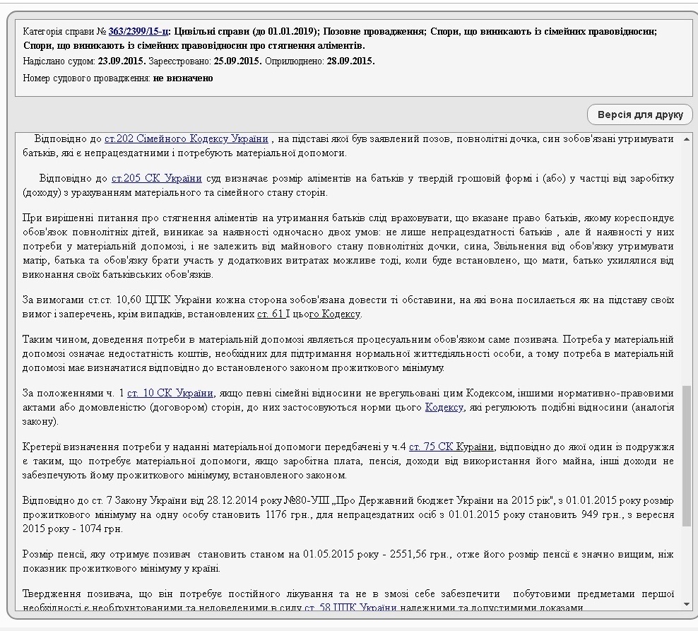 Однако судья Елена Скарлат отказала в удовлетворении исковых требований. Основаниями для отказа, как следует из материалов дела, является то, что Георгий Рябошапка получает пенсию по возрасту, которая на тот момент составляла 2551,56 грн и превышала установленный на тот момент законодательством прожиточный минимум (1176 грн), а также на правах совместной собственности отцу, согласно информации суда, принадлежала 1/3 квартиры. Кроме того, он указан как владелец автомобиля.