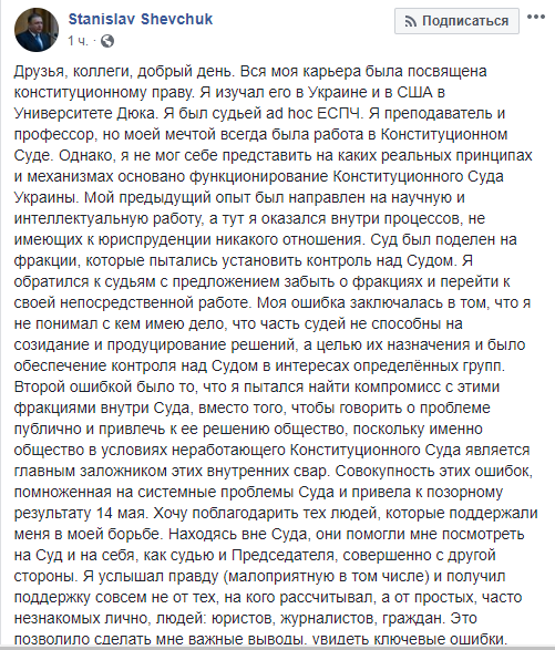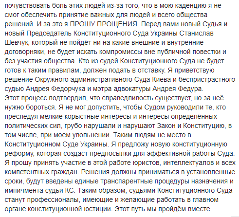 "Таким людям не место в Конституционном Суде Украины. Я предложу новую конституционную реформу, которая создаст предпосылки для эффективной работы Суда. Я прошу принять участие в этой работе юристов, интеллектуалов и всех компетентных граждан. Решения должны приниматься в установленные сроки, будут введены единые транспарентные процедуры назначения и импичмента судьи КС. Таким образом, судьями Конституционного Суда станут профессионалы, имеющие и желающие работать в главном органе конституционной юстиции. Этот путь мы пройдем вместе", - подытожил Шевчук.
