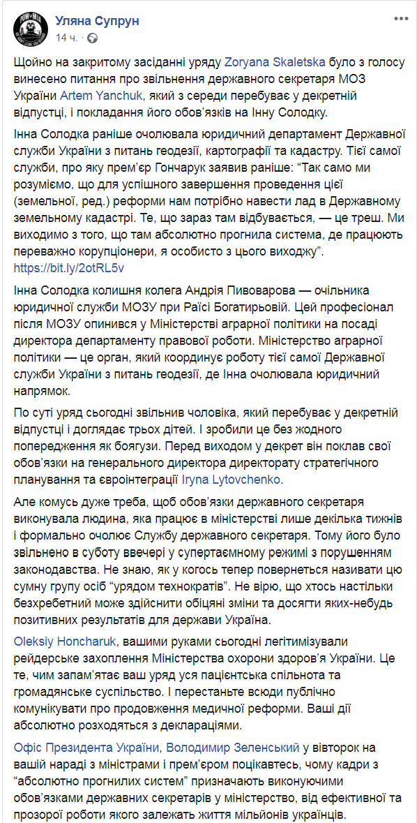 Бывшая глава Министерства здравоохранения Ульяна Супрун заявила, что увольнение государственного секретаря МОЗ Артема Янчука и возложение его обязанностей на Инну Солодку говорит о "рейдерском захвате министерства" и "свертывании реформ здравоохранения".