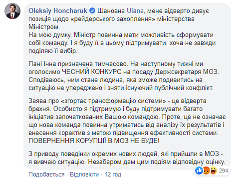 "Лично я поддерживаю и буду поддерживать много инициатив, начатых Вашей командой. Однако это не значит, что новая команда должна воздержаться от анализа их результатов и внесения корректив с целью повышения эффективности системы. Возвращения коррупции в Минздрав не будет!" - отрезал Гончарук.