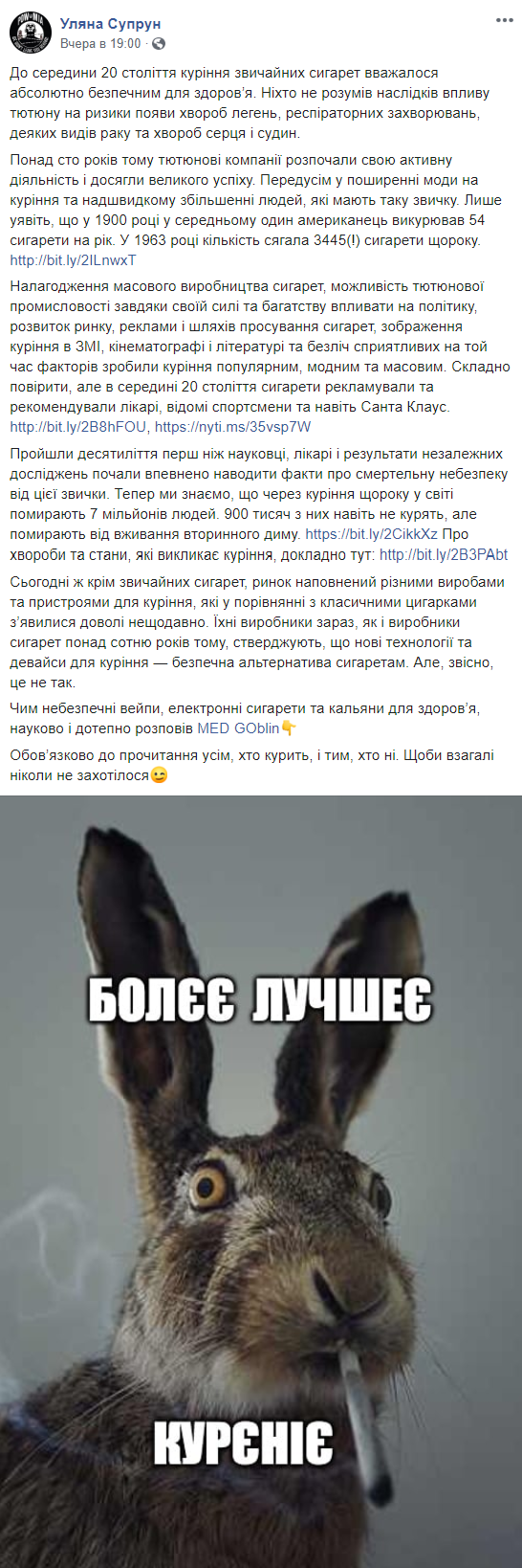 Бывший и.о. министра здравоохранения Уляна Супрун поделилась в Facebook публикацией пользователя MED GOblin о вреде курения и прокомментировала его исторической справкой о сигаретах.