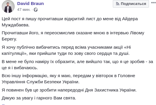 "Этот пост я пишу прочитав открытое письмо ко мне от Айдер Муждабаев. Прочитав его, я переосмыслил сказанное мной в интервью Левому Берегу. Я хочу публично извиниться перед всеми участниками акции "Нет капитуляции", которые пришли туда по зову своего сердца и души. У меня не было намерения их обидеть, но получилось так, что я это сделал - за это я и извиняюсь. Всю остальную информацию, которую я имею, передам во вторник в Управление Службы Безопасности Украины", - написал глава фракции власти.