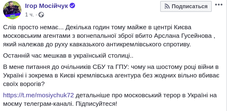 По словам бывшего нардепа, застрелили Арслана Гусейнова, который принадлежал к движению "кавказского антикремлевского сопротивления". Об этом Игорь Мосейчук сообщил на Facebook.