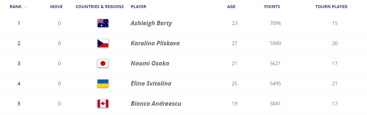 Первая в рейтинге - австралийка Эшли Барти (7096). Далее расположились чешка Каролина Плишкова (5940) и японка Наоми Осака (5621). Украинка Свитолина с 5495 очками всего на несколько очков опережает Бьянку Андрееску из Канады (5041).